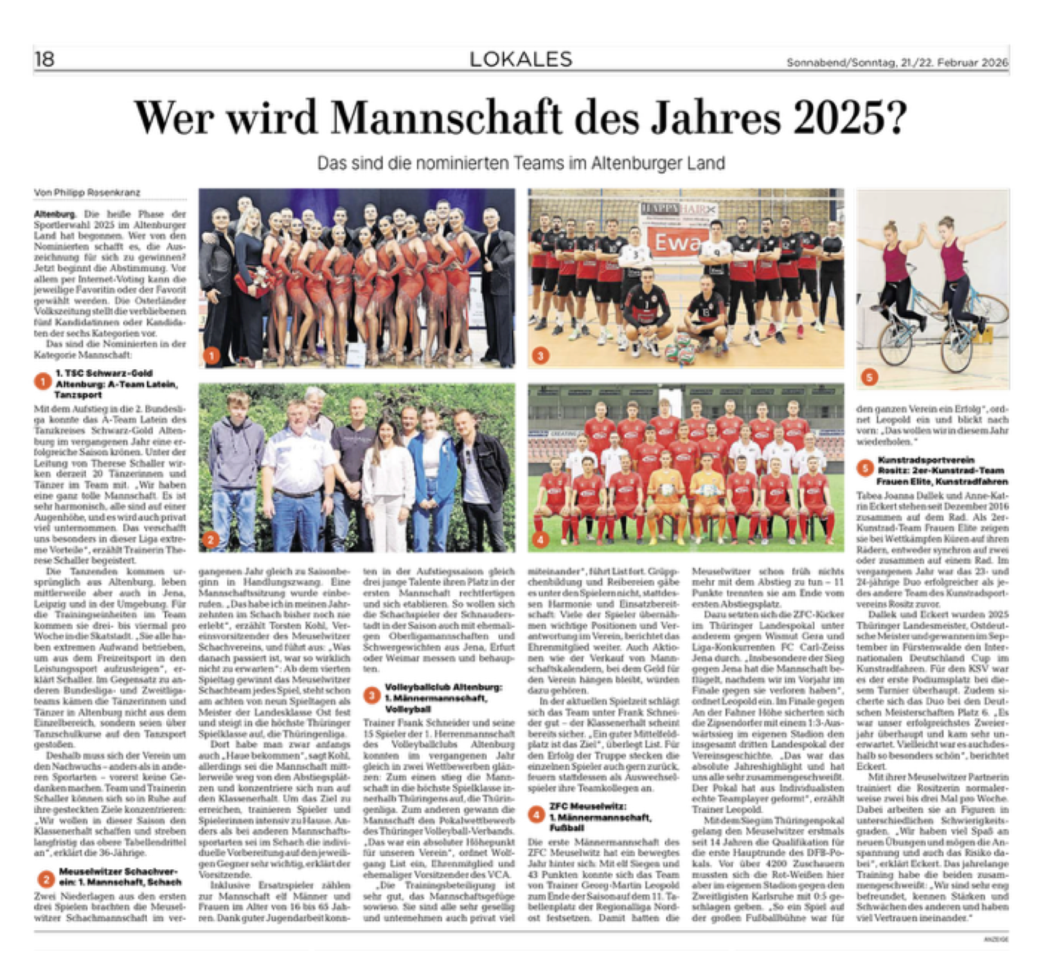 Mit der Veröffentlichung der sechsten Wertungskategorie ist am 21.02. der Startschuss füs Sportler-des-Jahres-2025 Voting gefallen. Nun läuft der zweiwöchige Votingzeitraum (online und per Stimmzettel im Osterland Sonntag 22.02. und 01.03.), der am 05.03. endet.
